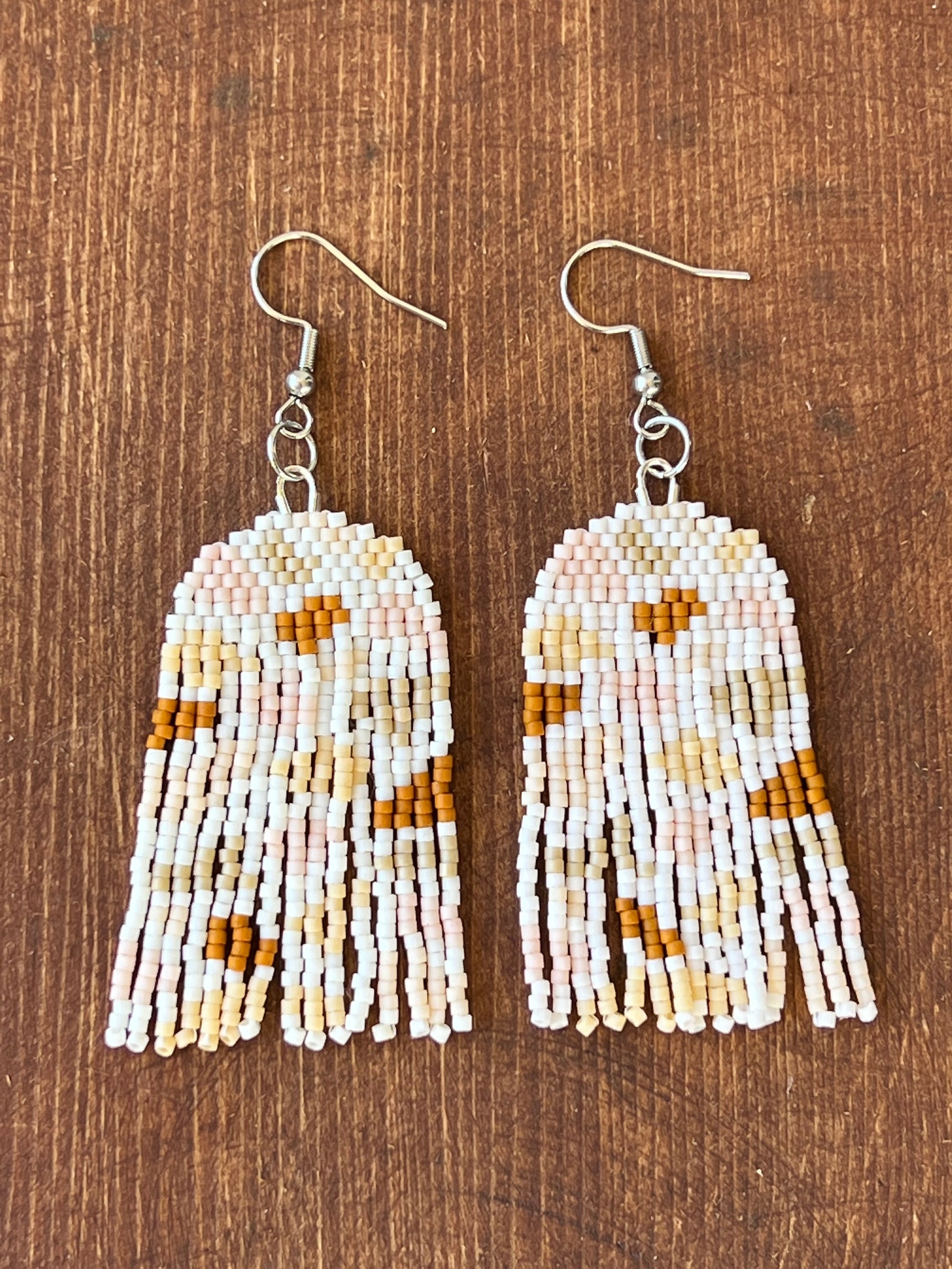 To extend the life of your earrings and keep them looking their best, hang them up or lay them flat when they are not being worn. Thread has a memory and will retain its shape so keep strands straight to avoid unwanted curves and crinkles. To flatten the woven part of your earrings you can lay them on a flat surface and smooth them with the back of your finger. Avoid contact with liquids, extreme temperatures, humidity, and sharp objects. Always handle beaded jewelry with clean hands.